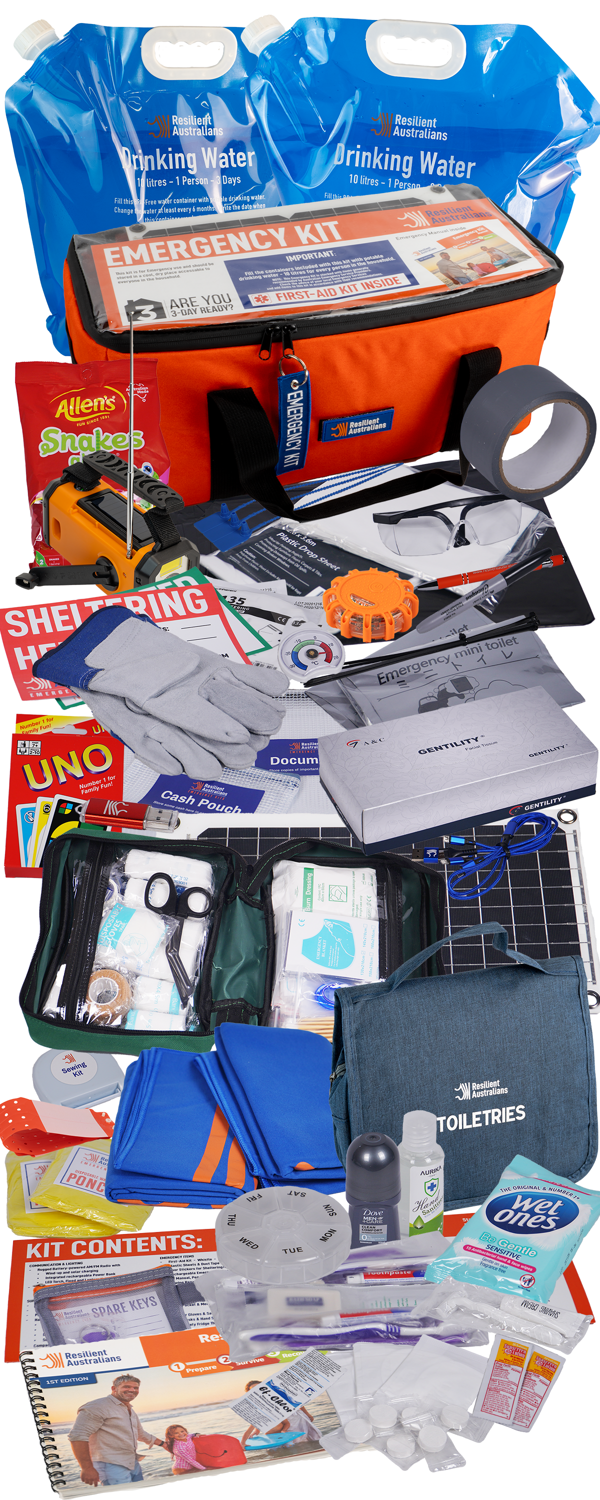 Our Emergency Kit includes an Emergency Manual prepared by local specialists, with advice tailored to large-scale emergency events and disasters in Australia.