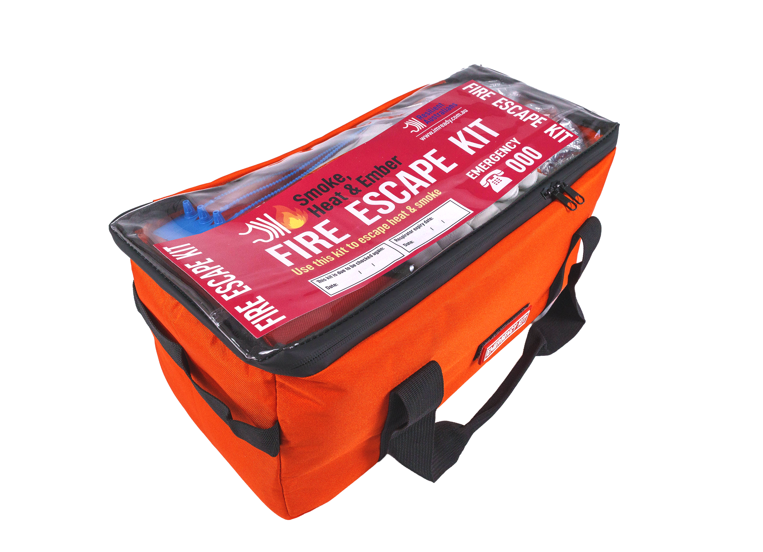 Our Fire Escape Kit comes in a Resilient Australians custom-made, rescue-orange bag with waterproof zips and a transparent lid. It features durable webbing handles and tamperproof, numbered zip ties to seal the kit - providing peace of mind that nothing vital has been removed.
